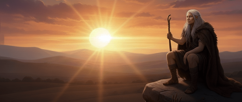 Kira era uma mulher muito respeitada, pois já havia conseguido ajudar sua tribo a sobreviver a muitos invernos. Mas ela também carregava um peso eterno no coração, pois havia perdido muitos filhos e filhas no passado, por causa da fome nos invernos mais rigorosos, quando o plantio e o armazenamento de grãos ainda não eram técnicas tão bem dominadas. Mas agora, após dominar o cultivo do trigo, sua tribo havia crescido de dez para dezenas de pessoas, e em breve seriam centenas. Kira estava orgulhosa… Sentada numa pedra naquela madrugada fria, ela observa aliviada o nascer do sol após a noite mais longa do ano : o solstício de inverno.